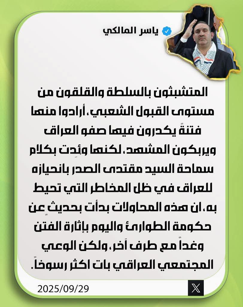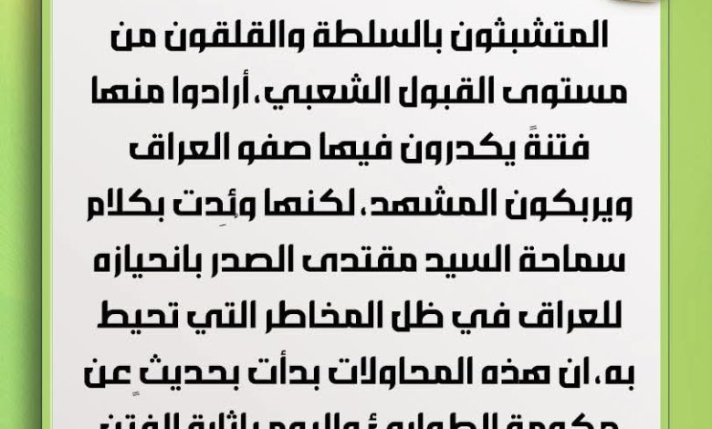 المتشبثون بالسلطة والقلقون من مستوى القبول الشعبي ، أرادوا منها فتنة يكدرون فيها صفو العراق ويربكون المشهد، لكنها وأدت بكلام سماحة السيد مقتدى الصدر بانحيازه للعراق في ظل المخاطر التي تواجهها الميناء به ان هذه المحاولات بدأت بحديث عن حكومة الطوارئ واليوم بإثارة الفتن وغداً مع طرف آخر ، ولكن الوعي المجتمعي العراقي بات اكثر رسوخاً.