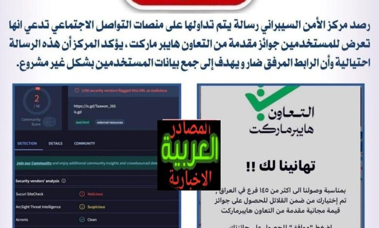 رصد مركز #الأمن_السيبراني رسالة يتم تداولها على منصات التواصل الاجتماعي تدعي انها تعرض للمستخدمين جوائز مقدمة من التعاون هايبر ماركت ، يؤكد المركز أن هذه الرسالة احتيالية وأن الرابط المرفق ضار ويهدف إلى جمع بيانات المستخدمين بشكل غير مشروع.