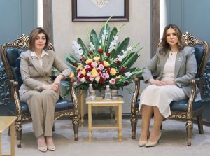 التقت وزيرة الهجرة والمهجرين السيدة إيڨان فائق جابرو، نقيب المحامين العراقيين السيدة أحلام اللامي، وسط بغداد، لمناقشة جملة من المواضيع التي تخص العوائل النازحة والعائدة من النزوح من ضمنها المتواجدين في مركز (الأمل) لإعادة التأهيل المجتمعي للنازحين في نينوى.