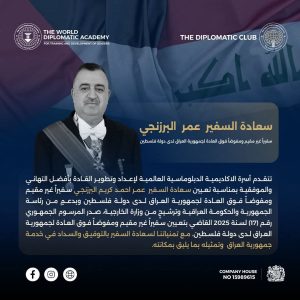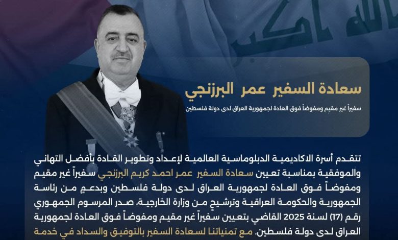 وبدعمٍ من رئاسة الجمهورية والحكومة العراقية وترشيحٍ من وزارة الخارجية، صدر المرسوم الجمهوري رقم (17) لسنة 2025 القاضي بتعيين سفيراً غير مقيم ومفوضاً فوق العادة لجمهورية العراق لدى دولة فلسطين.