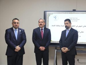 وأضافت الهيئة إنَّه تمَّت إقامة أربع حلقاتٍ نقاشيَّةٍ لدراسة الدبلوم العالي المهنيّ في الاختصاصات ذات الصلة بمُكافحة الفساد، حاضر فيها نائب رئيس الوزراء / وزير التخطيط ( د. محمد علي تميم) ووزير العدل ( د. خالد شواني)، ووزير الصناعة والمعادن (د. خالد بتَّال)، فضلاً عن المُدير العامّ لدائرة التخطيط والبحوث في الهيئة.