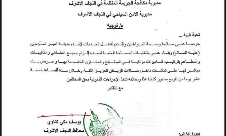 محافظ النجف يوجّه جميع المقاهي والكافيهات والمطاعم بتركيب كاميرات مراقبة على المطابخ وعرضها ببث مباشر عبر الشاشات للزبائن داخل المطعم .