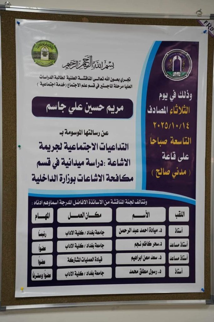 كلية الآداب في جامعة بغداد تكرّم الفريق الدكتور سعد معن لدوره الأكاديمي في مناقشة رسالة ماجستير حول “جريمة الإشاعة”