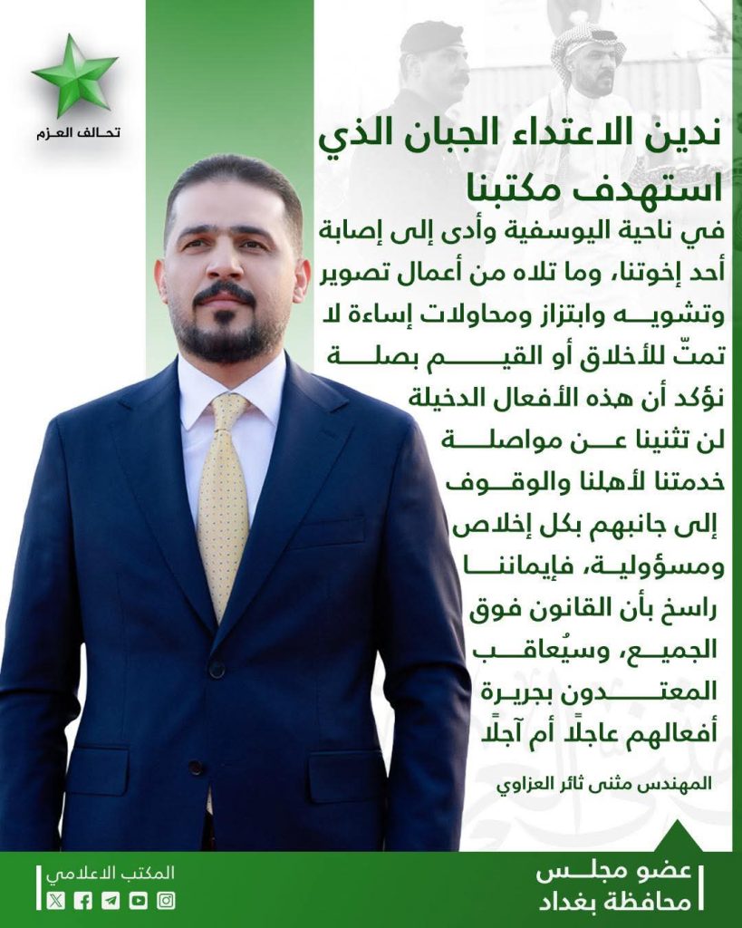 إصابة شقيق عضو مجلس محافظة بغداد مثنى العزاوي بعد تعرضهم لهجوم مسلح في اليوسفية