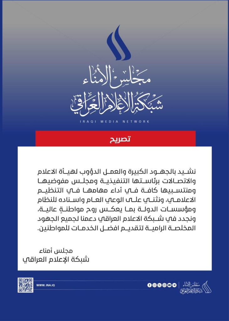 #مجلس أمناء شبكة الإعلام العراقي: ▪️نشيد بالجهود الكبيرة والعمل الدؤوب لهيئة الإعلام والاتصالات