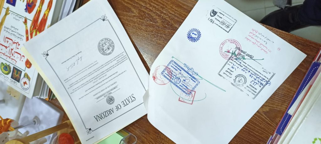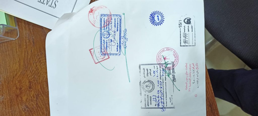 والمصادقة على الوثائق الرسمية من قبل الجامعة الأمريكية مصادقتها من قبل وزارة الخارجية الأمريكية وقسم التصديقات في السفارة العراقية.