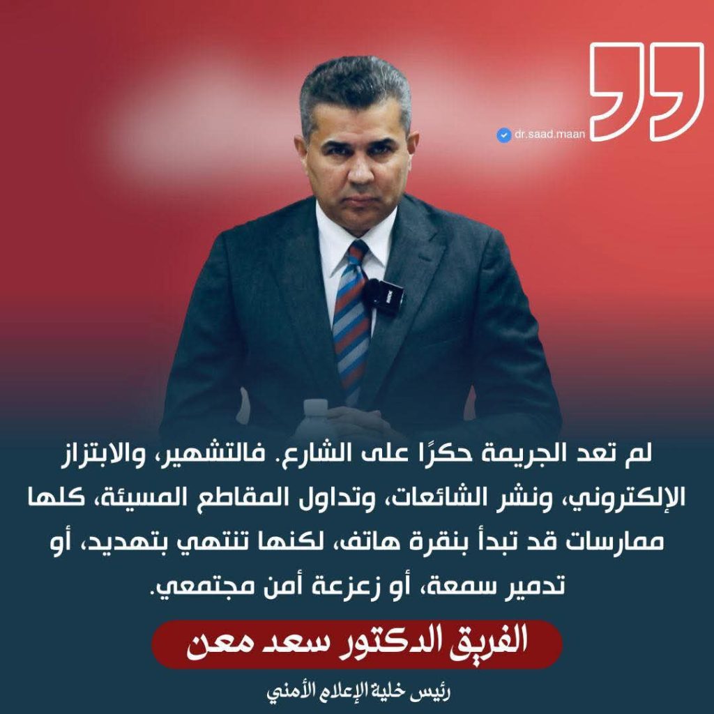 لم تكن النساء حكرًا على الشارع. فالتشار، والبتاز الإلكتروني، وسفن الشحن، وسفن الشحن المسائي، وكل النساء قد يبدأن بنقرة الهاتف، وينتهي بنقرة، أو نقرة، أو نقرة، أو نقرة، ونصر مجتمعي. الفريق الدكتور سعد معن رئيس خلية الاعلام الامني